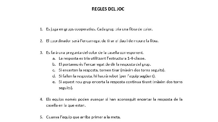 Provam el material! És un joc de preguntes on hi ha 3 tipus de targetes: ❖Grogues: sobre capes de la Terra i la geosfera. ❖Verdes: sobre roques i minerals. ❖Cels: sobre el relleu d’Espanya. Es juga en grups cooperatius amb una adaptació de l’estructura 1 -2 -4, ja que es fa 1 -4 classe.