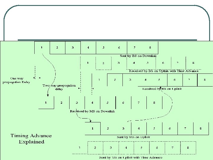 Adaptive Frame Synchronization l l Timing Advance in Tx time corresponding to propagation delay 6 bit number used; hence 63 steps 63 bit period = 233 micro seconds (round trip time) • 35 Kms