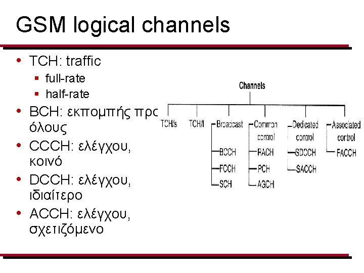 Traffic channels • Full rate: 22. 8 kbps § speech data: 13 kbps voice data + FEC § packet data: 12, 6, 3. 6 kbps + FEC • Half rate: 11. 4 kbps • To achieve higher rates multiple logical channels have to be allocated (GPRS does this)