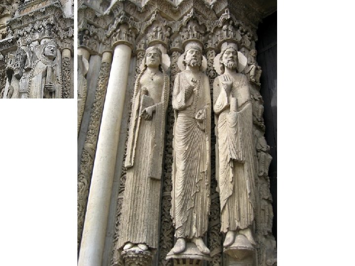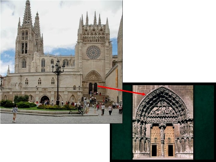Escultura La portada Gótica sigue siendo importante pero hay cambios. Las arquivoltas llevan figuras longitudinales, todas protegidas con el doselete. Cuando hay muchas figuras juntas en horizontal el doselete es corrido. El Tímpano se fragmenta en pisos horizontales, reservando la escena principal para el Pantócrator o el Crucificado. En España destacan las portadas de León y Burgos Portada del Sarmental A lo largo de los tres siglos el estilo evoluciona. · Durante el XIII los ropajes son sencillos, de escasos pliegues y composición clara. El rostro es triangular, de mentón agudo, ojos rasgados y expresión sonriente. · En el XIV las figuras se alargan y se curvan, los ropajes son sinuosos en constante curva y contracurva, es el estilo Internacional. · A partir del XV se crean escuelas como la de Borgoña donde se abandona lo curvilíneo y se vuelve al naturalismo, con rostros más individualizados.