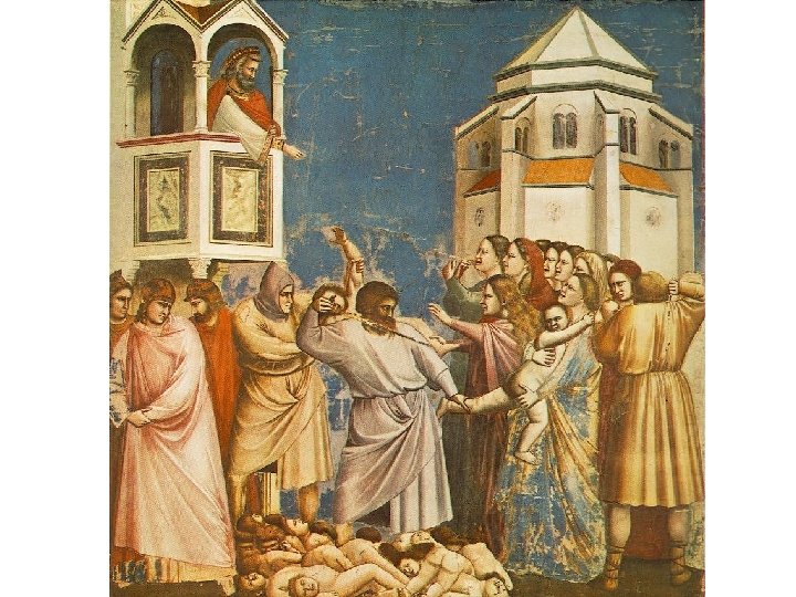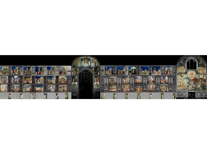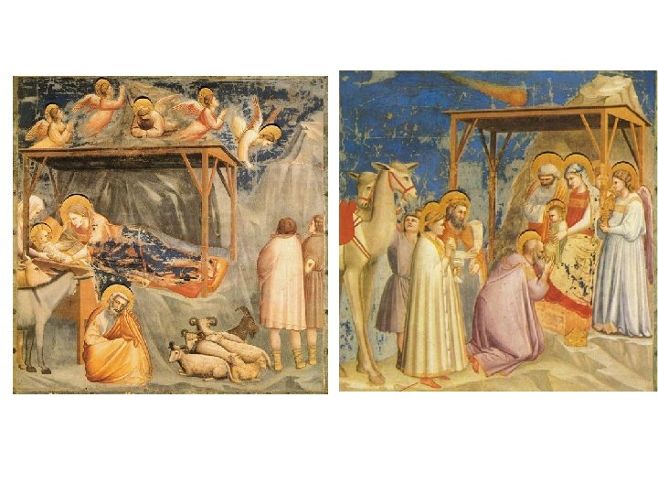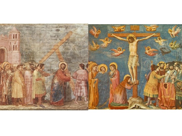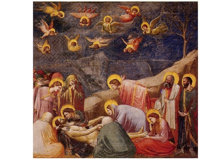 B. - Expresión dos sentimentos -É o primeiro pintor que introduciu na súa obra o sentimento, é dicir, as relacións existentes entre os distintos personaxes. -A expresión de sentimentos conséguea por medio dos xestos e actitudes que coloca ás figuras, que dan dramatismo e teatralidade ás mesmas. -Giotto realiza sobre todo pintura mural xa que en Italia, debido á luz mediterránea, non construíron grandes ventás nos edificios. Nelas introduce unha innovación: a de narrar a vida dun santo (San Francisco) separando as escenas, xa que logo, rompe co criterio medieval de acumular varias escenas no mesmo espazo -Os rostros das súas figuras non están individualizados. Só o individualiza ao realizar un retrato a Dante, tamén innovación, pois por primeira vez aparece o retrato na pintura italiana. -Todas estas innovacións que introduce Giotto na pintura italiana (naturalismo, volume, profundidade, amor á paisaxe, introducilo por 1ª vez na pintura italiana, etc. ) anúnciannos a arte renacentista por iso é considerado, o pai da pintura moderna.