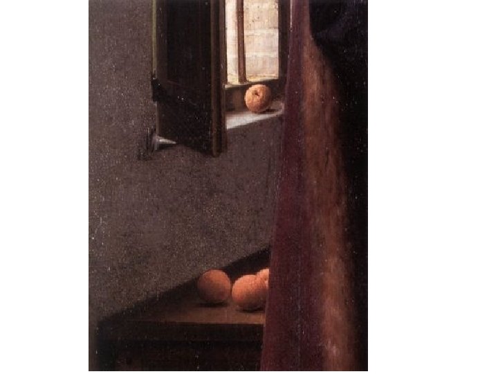 C. -A creación dun espazo veraz Crea un espazo real e convincente mediante: -A representación das escenas en interiores, onde se reflicte a típica casa flamenga burguesa: confortable, con espazosas ventás e con gran cantidade de obxectos (cadros, potes de barro e metal, floreiros, etc. ), e en paisaxes naturais aos que concede gran importancia nos cadros, ata cando unha escena desenvólvese nun interior aparece a través dunha porta ou fiestra. A difusión da luz sobre as figuras representadas (humanas, obxectos, paisaxe. . . ). Co fin de evitar unha simple acumulación de detalles sen ningunha unidade, crea un espazo delimitado pola luz, esta une todos os ambientes e dá harmonía a todos os compoñentes do cadro. A luz acariña as superficies das cousas e define a atmosfera, con ela consegue a sensación de profundidade.