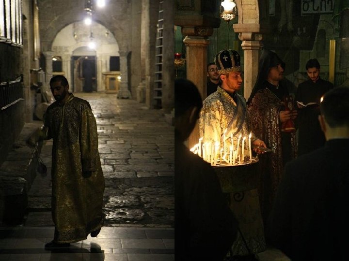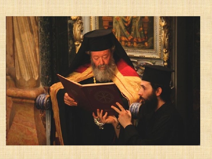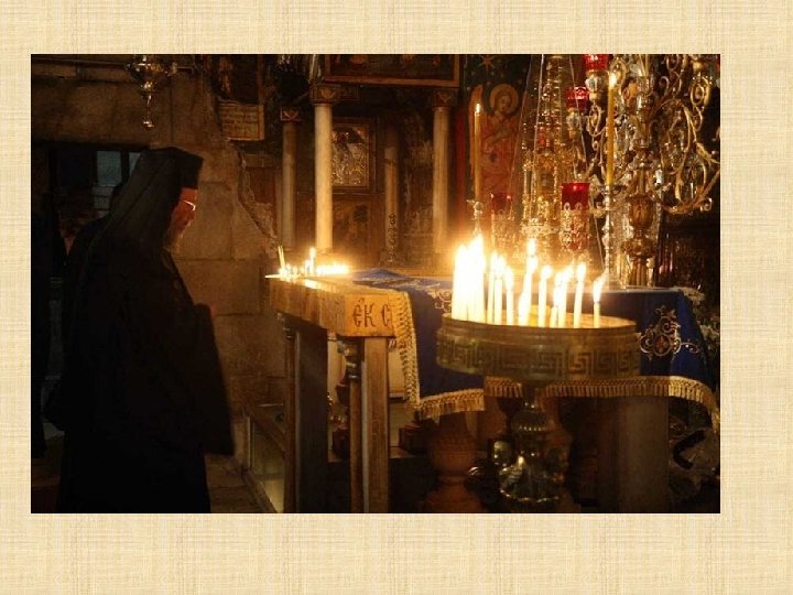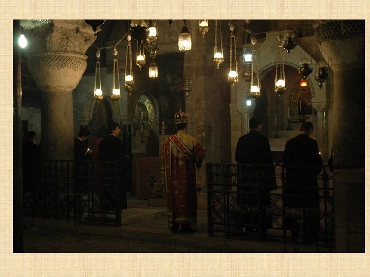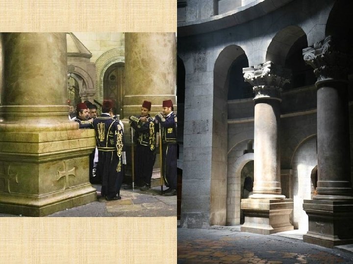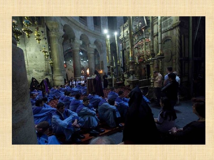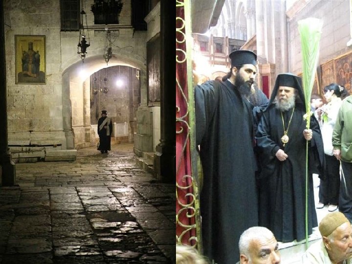 GRIEGOS on el Concilio de Calcedonia del 451 d. C. , se produce una sucesión de patriarcas ortodoxos de fe calcedonia. La posición de la Iglesia griega, que se impuso desde 1533, explica por qué a la iglesia local se le llama comúnmente “griego ortodoxa”. El patriarcado ortodoxo de Jerusalén instituyó en el siglo XV la“Confraternidad del Santo Sepulcro”dedicada a la Custodia de los Lugares Santos: la presencia de las letras OT sobrepuestas, Hàghios Tàphos (Santo Sepulcro) indican los lugares de la Basílica marcados por la presencia griega. En el interior del Santo Sepulcro, que ellos llaman Anastasis es decir, basílica de la Resurrección, el patriarca tiene su propia cátedra colocada en el amplio espacio del Catholicon.