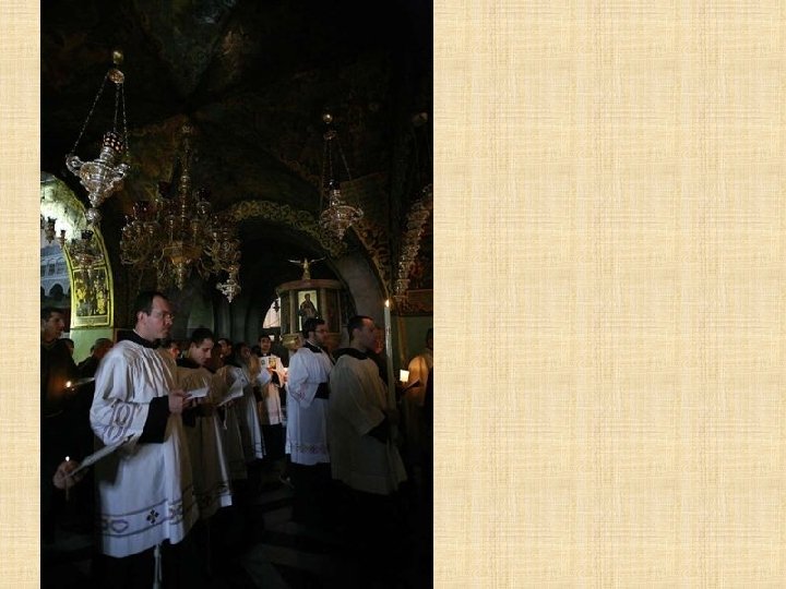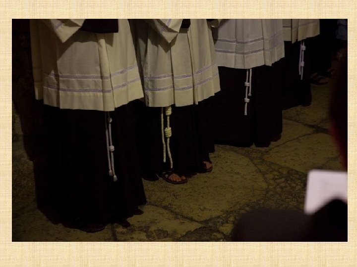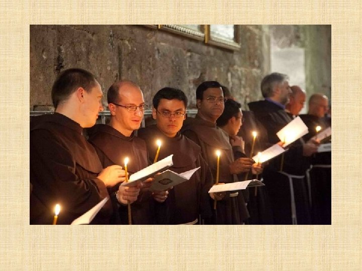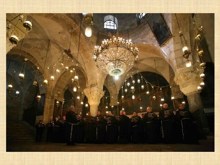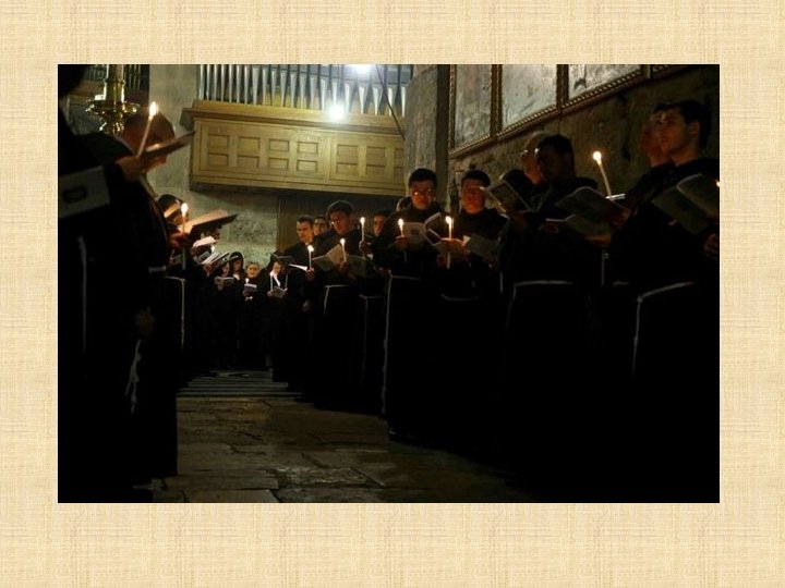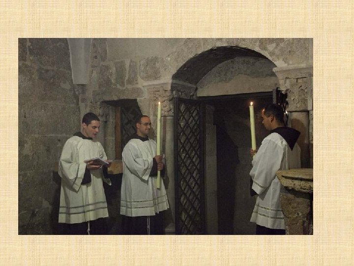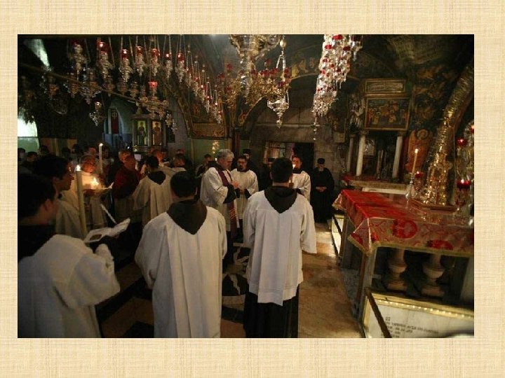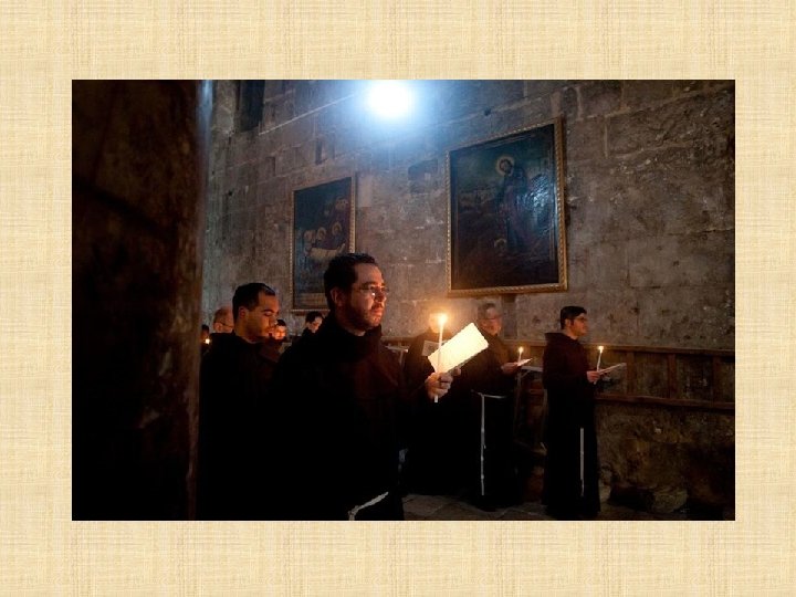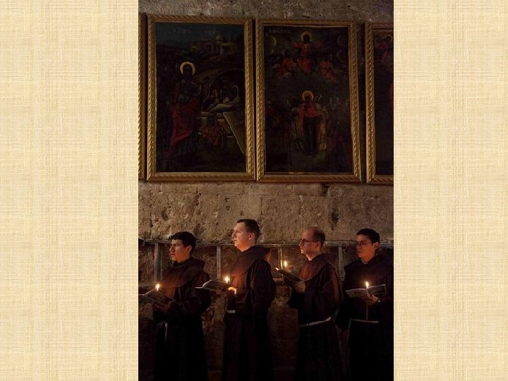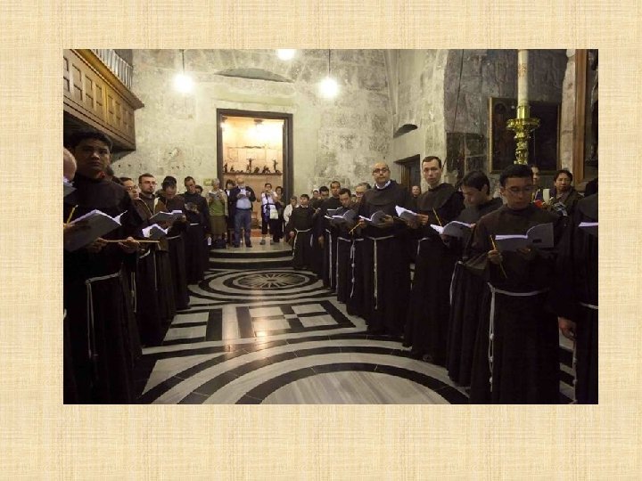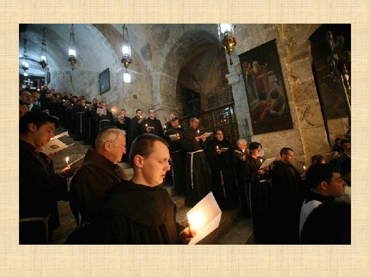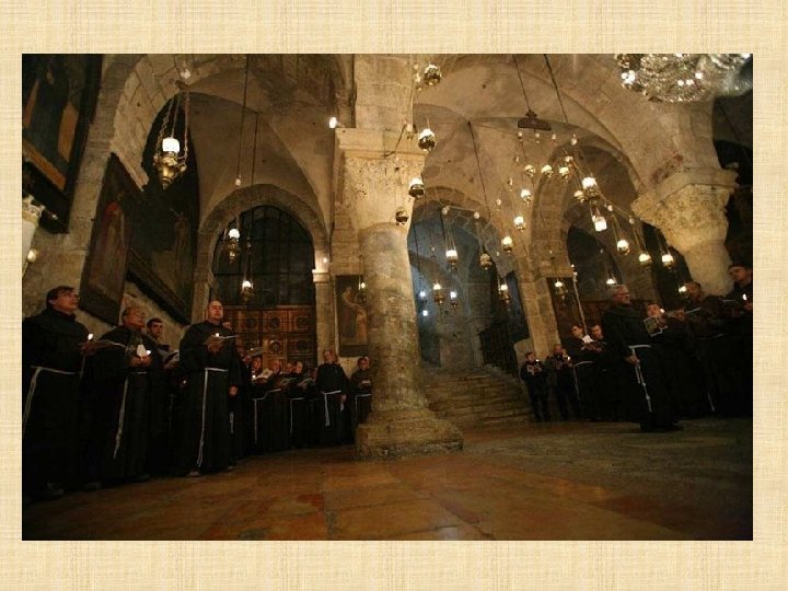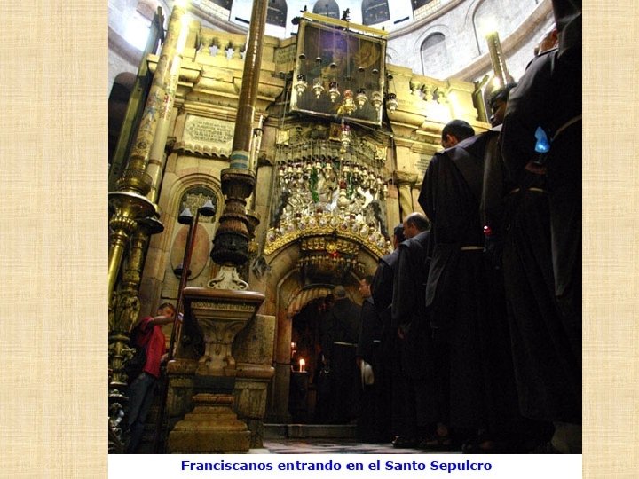 LATINOS Franciscanos Los Frailes Menores tienen el deber de custodiar en Tierra Santa los lugares consagrados por la presencia de Jesús. Es una misión especial que les fue encargada por la Santa Sede desde 1342, en memoria de la visita profética de San Francisco al sultán de Egipto en 1219. Los Franciscanos ofician todos los días en el Santo Sepulcro siguiendo la liturgia católica romana y prestan asistencia a los peregrinos que visitan el santuario.