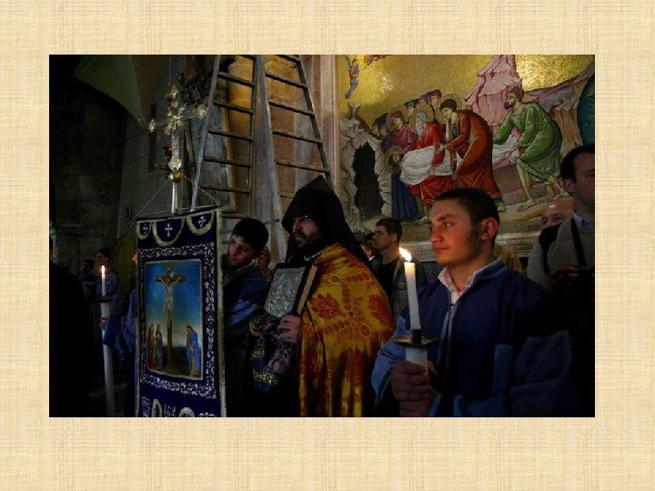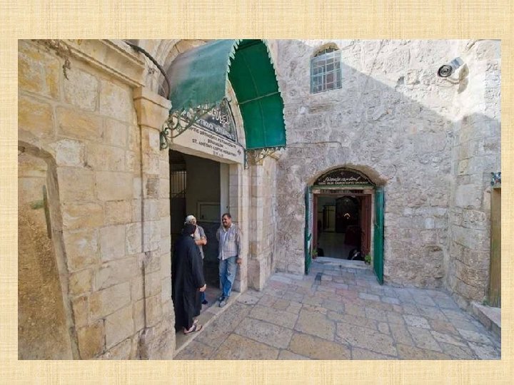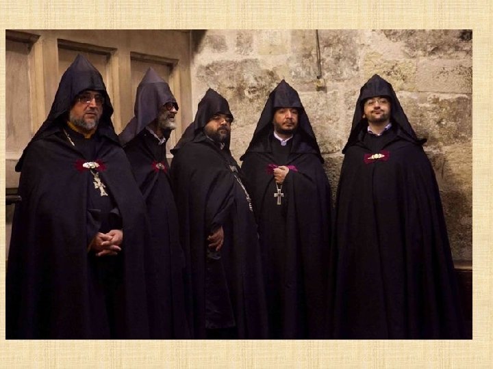 ARMENIOS La Iglesia armena pertenece al grupo de las tres Iglesias cristianas “antigua-orientales” que provienen de la tradición siria, armenia y alejandrina, así denominadas por la antigüedad de sus ritos que exprimen características peculiares étnicas y nacionales. El pueblo armenio, el primero que aceptó el cristianismo como religión nacional, se encuentra presente en Jerusalén a partir del siglo V, cuando se establecieron las primeras comunidades, y consiguió todo un barrio desarrollado alrededor de la Catedral de S. Jaime, barrio que todavía hoy ocupa un sexto de toda la ciudad vieja.