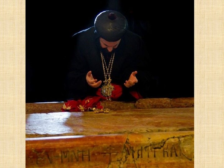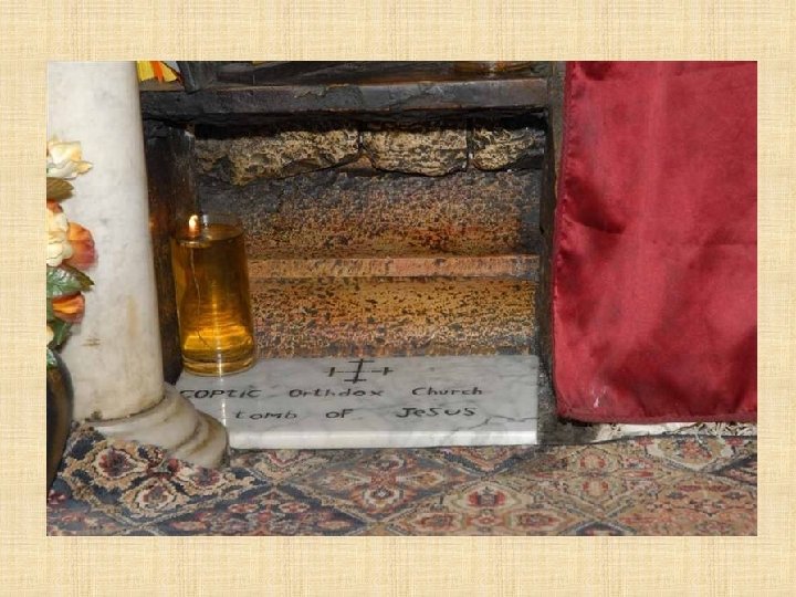 BANCO DE PIEDRA SOBRE EL CUAL FUE DEPOSITADO EL CUERPO DE CRISTO DURANTE LOS TRES DIAS DE PERMANENCIA EN EL SEPULCRO (14 c 15, 46) EL CUAL ESTA RECUBIERTO POR TRES ESTRATOS DE MARMOL PRECIOSO