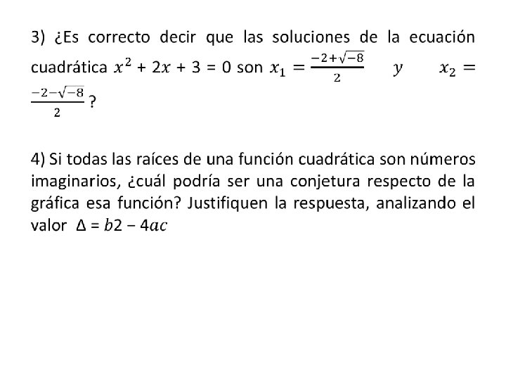 Función n° 2 Intersección con eje y: (0, 3) Vértice: (-1, 2) Responde: a) La diferencia en la grafica es que con la función n° 1 corta en dos punto al eje x, en cambio la función n° 2 no corta el eje x. b) Soluciones complejas o imaginarias c) Si, son correctas d) Cuando el Δ<0, significa que no hay puntos de intersección con el eje x, ya que la ecuación tiene soluciones imaginarias, por lo tanto al graficar la parábola no cortara al eje x.