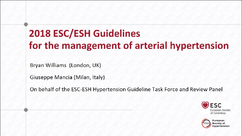 Nuevos Conceptos Guías ESC/ESH 2018 • Medición de PA - Mayor uso de mediciones de PA fuera de la oficina con MAPA o CDPA, como opción para confirmar el diagnóstico de HTA, detectar HTA delantal blanco o enmascarada y control de PA con monitor • Tratamiento menos conservador de HTA- especialmente en pacientes mayores o muy mayores - Umbrales de reducción de PA y metas de tratamiento para pacientes mayores con énfasis en consideraciones de edad biológica más que cronológica (ej. Importancia de fragilidad, independencia y tolerabilidad al tratamiento) • Nuevos rangos de metas en pacientes en tratamiento - Enfocar rangos de metas para pacientes en tratamiento para mejor identificación de metas de PA recomendadas y el límite más bajo de seguridad, de acuerdo a la edad del paciente y comorbilidades específicas