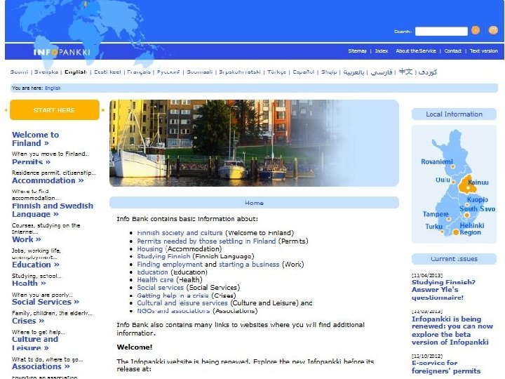 Webservices: Infobank. fi • Same content in all languages • Main content o o o Welcome to Finland Permits Accomodation Finnish language Employment Education Health Social services Crises Culture and Leasure NGOs