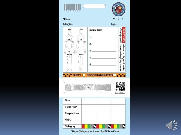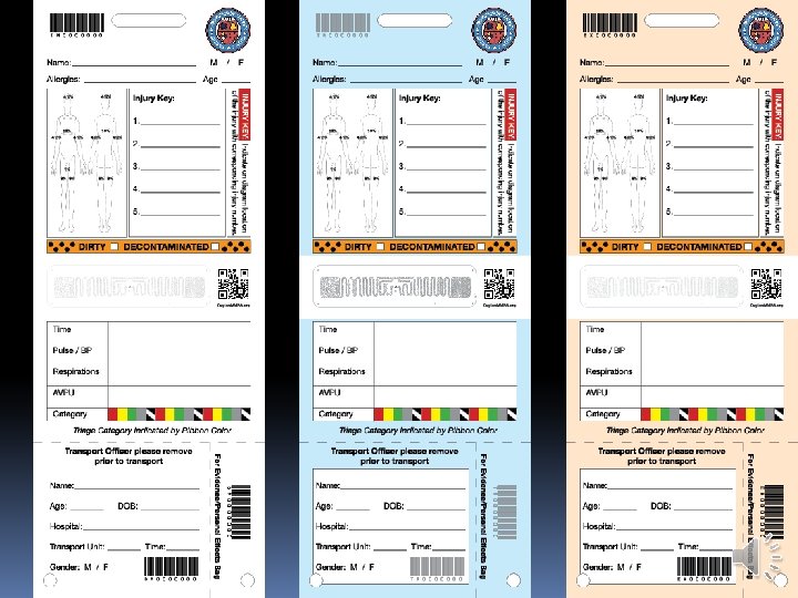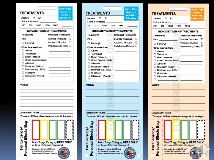 DAYTON MMRS TRIAGE MATERIALS Three versions of Triage Tags: Exercise tags: �Printed on orange background on cardstock �“For Exercise Use Only” watermark �Exercise tags have bar codes, numbers, and RFID tags �Intended to be used for significant exercises where simulated patients will actually be transported to hospitals �Available from Dayton MMRS