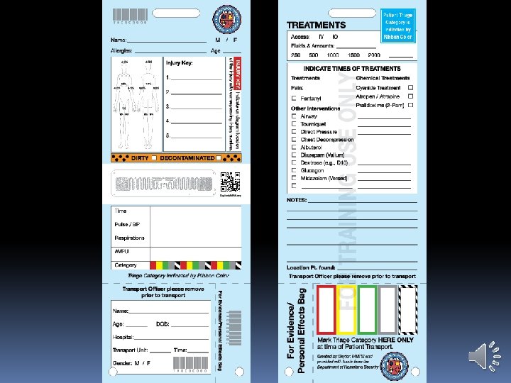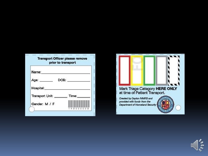 DAYTON MMRS TRIAGE MATERIALS Three versions of Triage Tags: Training tags: �Printed on blue background on cardstock �“For Training Use Only” watermark �No bar codes, numbers, or RFID tags. �Intended to be used for “Triage Tuesdays” and other drills �Inexpensive �Available in quantities from Dayton MMRS and county EMAs