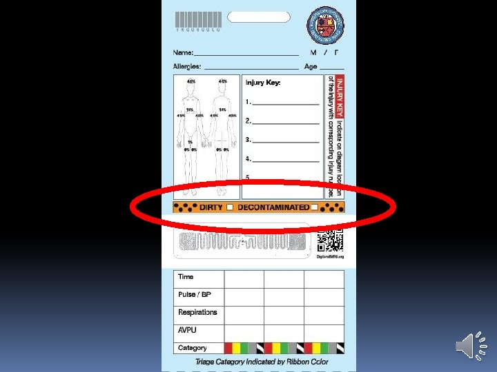 DAYTON MMRS TRIAGE RIBBON KIT Sixth color ribbon is Orange for contaminated patients Has dots to distinguish from red ribbons Contaminated patients initially get two ribbons (orange plus category color) Remove orange ribbon once patient decon’ed, but mark on Triage Tag