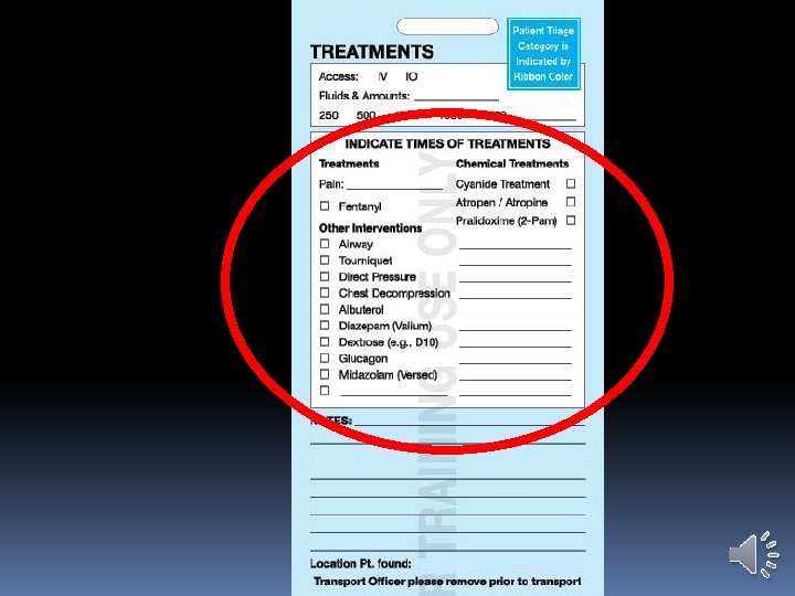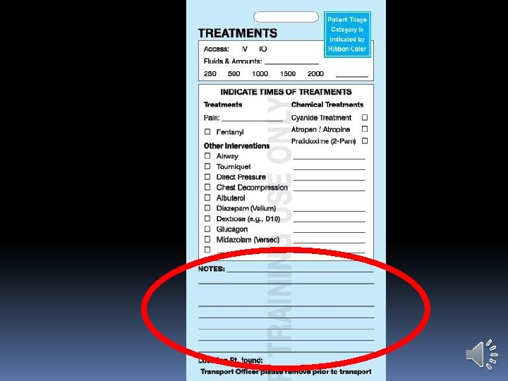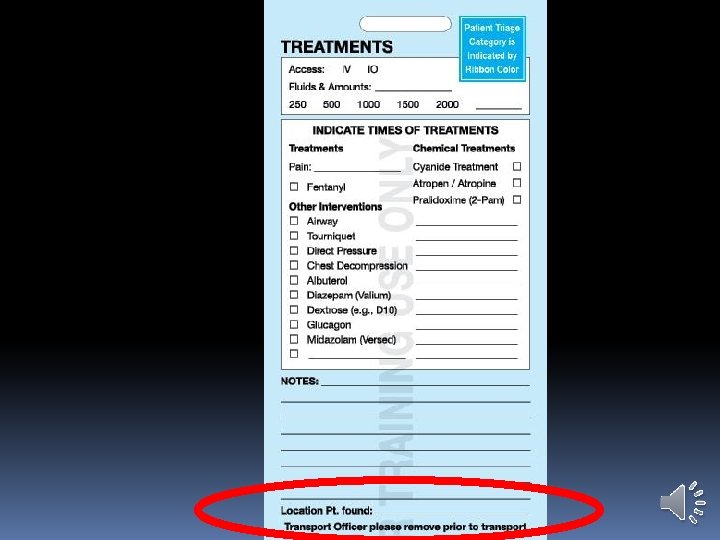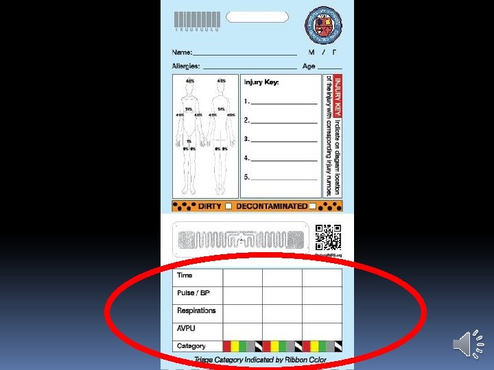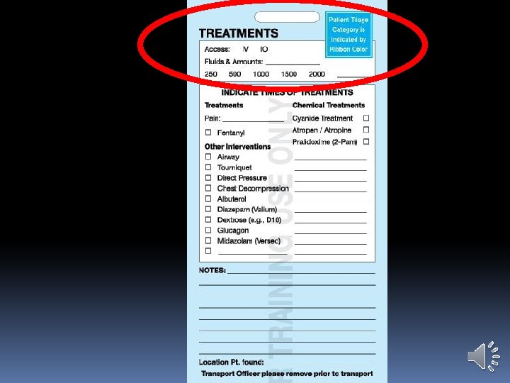Triage Ribbons Triage Ribbon is principal indication of the patient’s category Triage Ribbon used later to attach the Triage Tag Leave fairly long tails on each patient’s ribbon Attach ribbons on right wrist, if possible