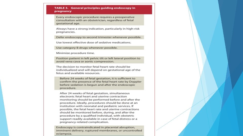 PROCEDURAL CONSIDERATIONS IN PREGNANCY Endoscopy should be deferred to the second trimester whenever possible and should always have a strong indication with a careful assessment of risk versus benefit. Every endoscopic procedure requires a preoperative consultation with an obstetrician, regardless of the gestational age of the fetus. The decision to monitor fetal heart rate and uterine contractions should be made with an obstetrician and should depend on the gestational age of the fetus and available resources (Table 3). For all GI endoscopic procedures, patients in the second or third trimester should not be positioned on their backs before, during, or after the procedure, because the pregnant uterus can compress the aorta or the inferior vena cava, resulting in maternal hypotension and decreased placental perfusion.