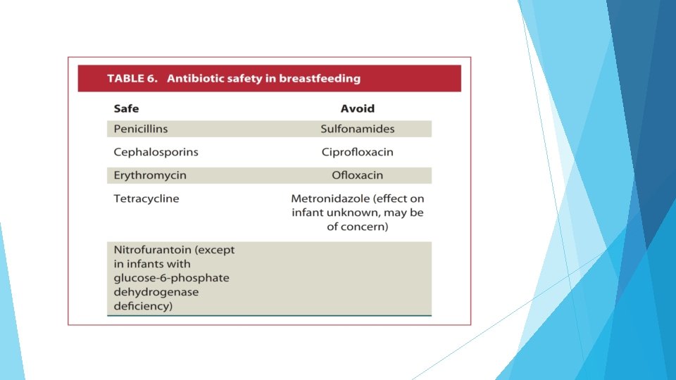 Antibiotics Penicillins and cephalosporins are excreted in breast milk in trace amounts and are considered compatible with breastfeeding. Ofloxacin and ciprofloxacin are excreted in breast milk, and their toxicity has not been well-studied. Because there is a potential for arthropathy in the infant, quinolones should be avoided in the lactating woman. It is recommended that sulfonamides be avoided in breastfeeding mothers of infants who are ill, premature, and glucose-6 -phosphate dehydrogenase deficient