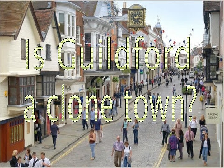 Four out of ten of the nation’s towns are “Clone Towns”… Clone Your mission is to find out whether Guildford is more… Clone town or Home town! GOOD LUCK!