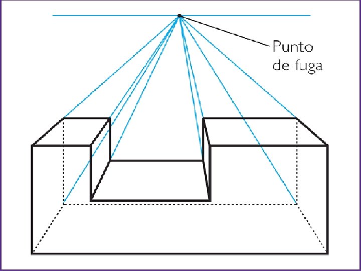 Perspectiva a un punto de fuga La perspectiva a un punto de fuga es utilizada cuando los objetos están de frente al observador. En ésta las líneas verticales y horizontales se dibujarán de la misma manera, mientras que las líneas que se alejan del observador tendrán una inclinación hacia el punto de fuga.