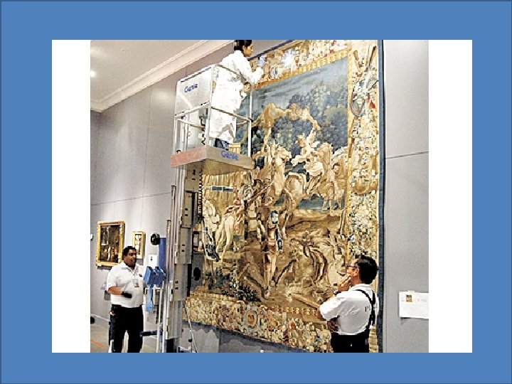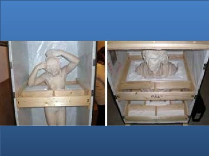 Transporte En un avión de pasajeros las piezas deben ir en la parte de arriba supervisadas por el curador de la muestra o un conservador durante el vuelo, NO PUEDEN IR en la sección de equipaje con otras maletas. A esa altura la temperatura se torna extremadamente fría y no hay oxígeno, por lo que resulta un ambiente demasiado hostil para cualquier obra de arte.