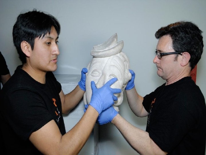 Manipulación de esculturas y otros objetos tridimensionales -Nunca mueva o levante una escultura o cualquier objeto tomándolo de un extremo o de un elemento saliente, tal como un brazo, la cabeza o un asa. Estas son a menudo las partes mas débiles de la escultura e inclusive en objetos de uso antiguos. -Antes de mover una escultura o cualquier objeto, asegúrese que esté firmemente sujetado a su base. -Para levantarlo, tome con una mano la base y con la otra el cuerpo del objeto. Si no lo puede hacer usted solo, hágalo con otra persona que lo tome de igual forma. Toda escultura o pieza debe trasladarse en la posición en que se halla normalmente. Nunca la incline al moverla