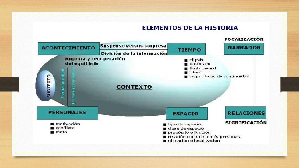 Elementos de la historia. • En la mayoría de los casos ir al cine es ir a ver una película que cuenta una historia. • Cuando nos referimos a historia hablamos del contenido del relato, de la acción que refleja, que puede ser mínima, trivial o hasta espectacular. • • • Los elementos básicos de una historia son: -el acontecimiento que narra -los personajes que participan de él -el tiempo en que se desarrolla -el espacio que lo acoge y queda retratado • Para el relato se dota a los personajes de datos diferenciadores y distintivos, los acontecimientos se ordenan en una secuencia que puede diferir de la cronológica, a cada aspecto de la historia, a cada momento se le asigna un tiempo, los lugares en los que se suceden los acontecimientos reciben unas características distintivas y se transforman en lugares específicos. Además se establecen distintas relaciones entre los elementos de la historia y se elige un punto de vista desde el que presentar la narración.