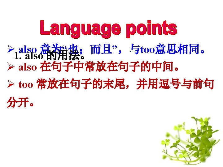 5. today 今天 on the weekend = on weekends 在周末 这两个词都是表示时间的,常放在句末。 I can’t swim with you today. 今天我不能和你一起去游泳了。 They want to play chess on the weekend. 他们想在周末去下棋。 Jack always go to the soccer club on weekends. 杰克总是在周末去足球俱乐部。