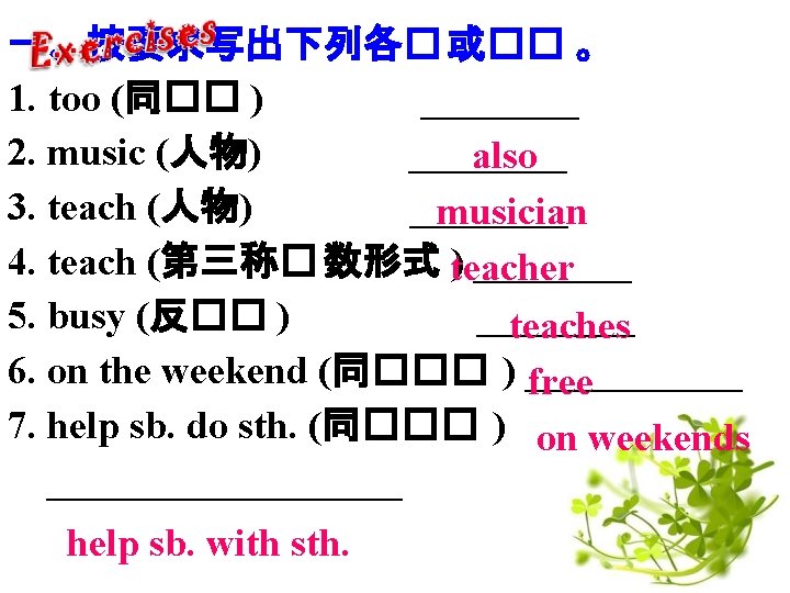 二、根据汉语提示完成句子。 1. Are you _____ good with (擅长) children? 2. I want ______ to join (join) the music club. 3. Mr Lin is very busy _______ on the weekend (在 周末). 4. They’re friendly. I want to ______ make friends (交朋友) with them.