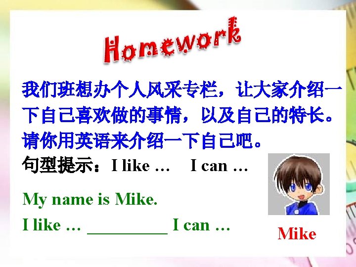 2. help (sb. ) with sth. 在某方面帮某助某人 Can you help me with my English? 你能帮助我学习英语吗? 也可以说help sb. do sth. 帮助某人做某事 Can you help me learn English? He wants to help the English-speaking students with sports. 他想帮助说英语的学生体育运动。
