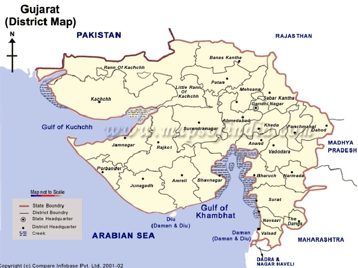 Geography o The State is situated on the west coast of India o Population of 50, 596, 992 o It is bounded by the Arabian Sea in the West, by the States of Rajasthan in the North and North-East, by Madhya Pradesh in the East and by Maharashtra in the South and South East. o The State has an international boundary and has a common border with Pakistan at the north-western fringe.
