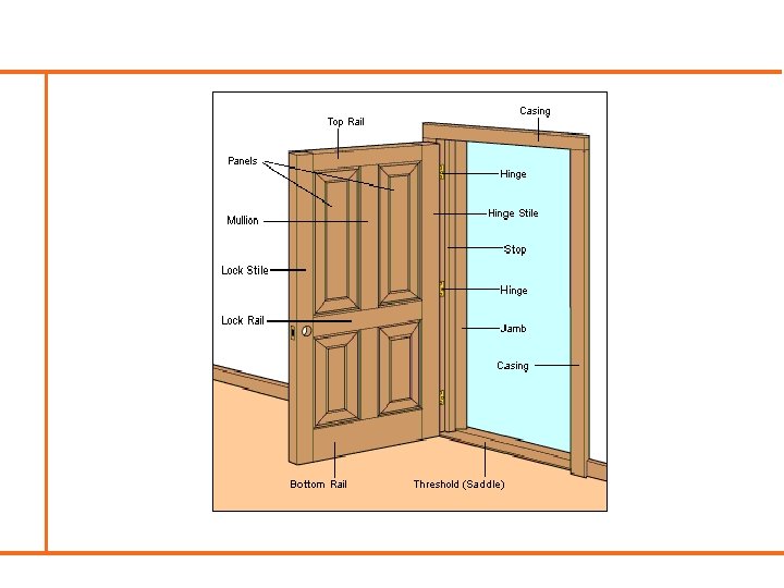 v Framed & Paneled Door (a) (b) (c) (d) (e) – These doors consist of a frame made up of Stiles a top rail sometimes an intermediate rail into this framework a plywood panel is fitted – This panel may fit into a groove or a rebate.