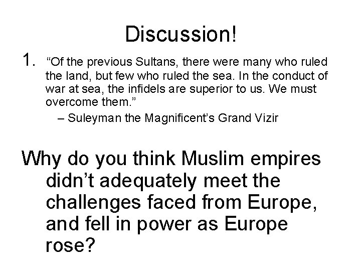 Discussion! 1. “Of the previous Sultans, there were many who ruled the land, but few who ruled the sea. In the conduct of war at sea, the infidels are superior to us. We must overcome them. ” – Suleyman the Magnificent’s Grand Vizir Why do you think Muslim empires didn’t adequately meet the challenges faced from Europe, and fell in power as Europe rose?
