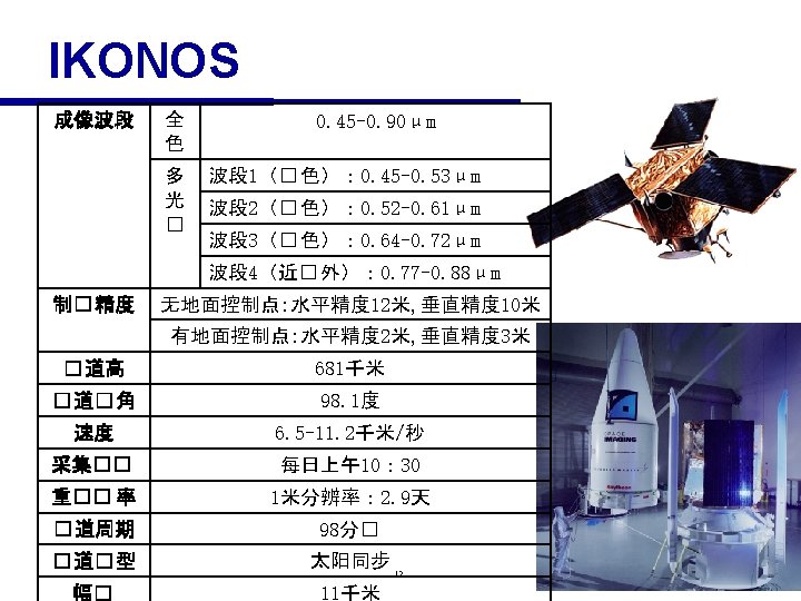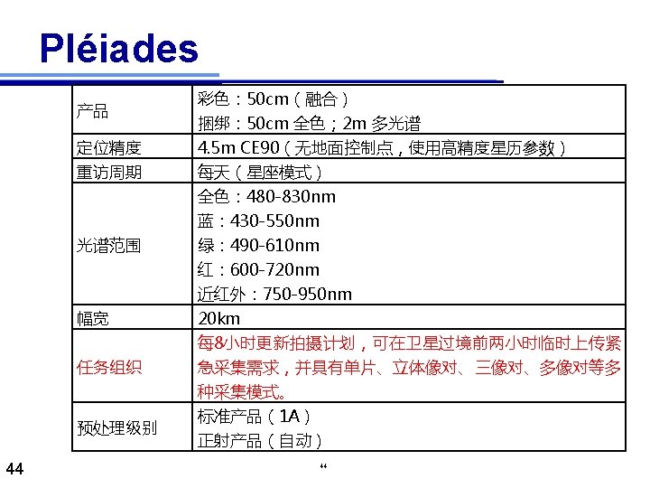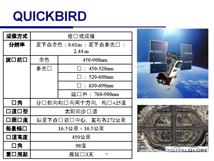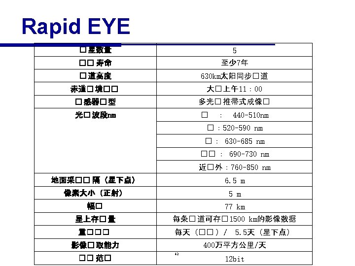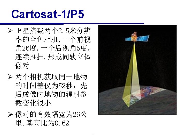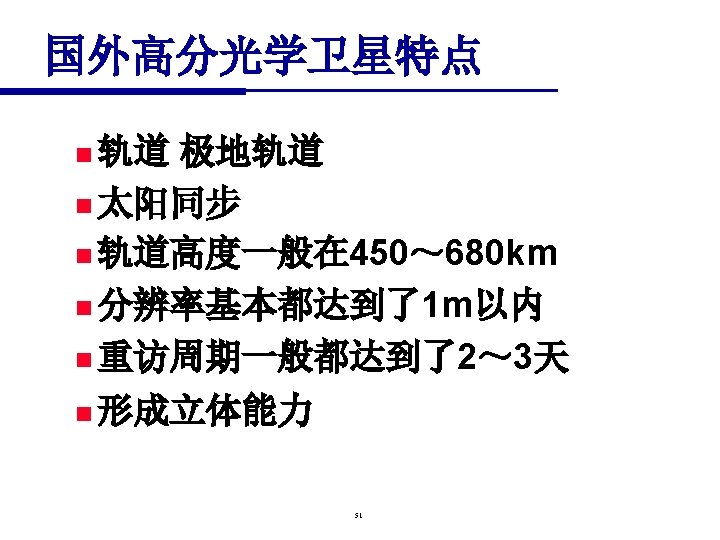 Geo. Eye n Spatial Resolution • Panchromatic Sensor 0. 41 meters x 0. 41 meters • Multispectral Sensor 1. 65 meters x 1. 65 meters n Spectral Range 450– 800 nm • • n n n 450– 510 nm (blue) 510– 580 nm (green) 655– 690 nm (red) 780– 920 nm (near IR) Swath Width 15. 2 km Dynamic Range 11 bits per pixel 无控制点定位精度 • 立体 CE 90: 4 m;LE 90: 6 m • 单片 CE 90: 5 m 40