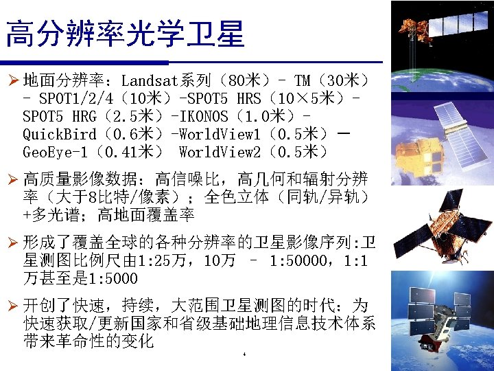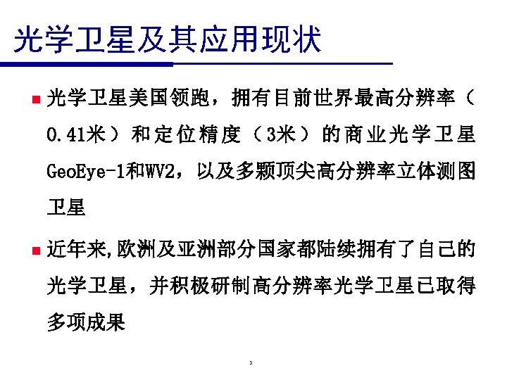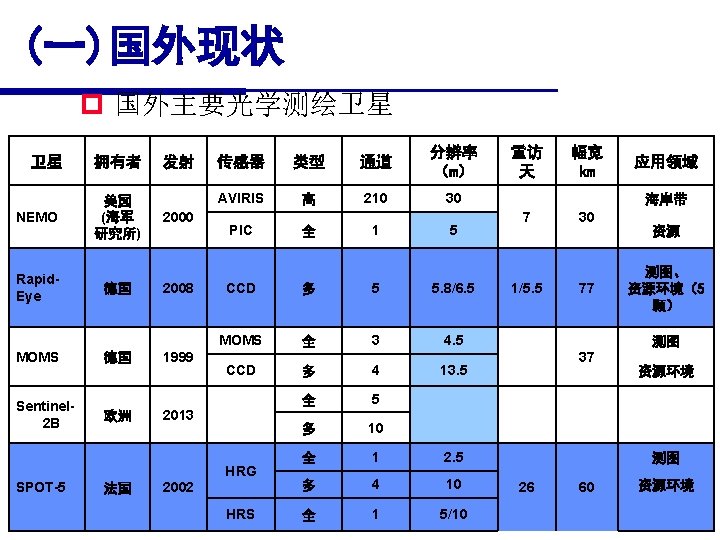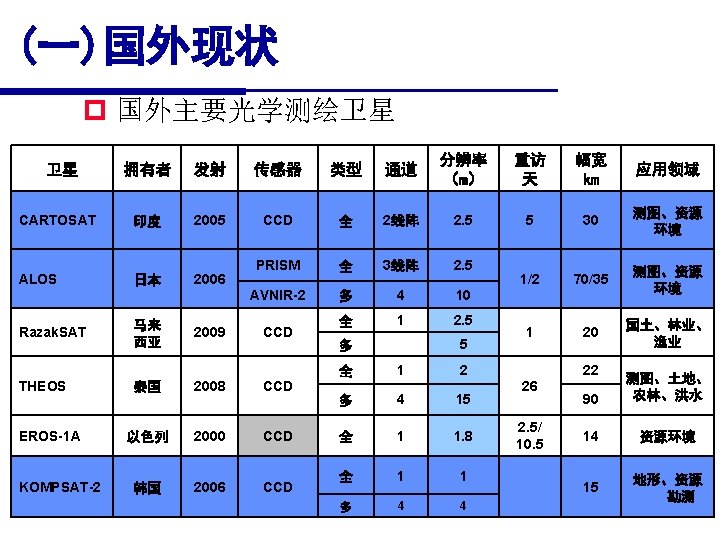 (一)国外现状 p 国外主要光学测绘卫星 卫星 拥有者 发射 传感器 类型 通道 分辨率 (m) 重访 天 幅宽 km 应用领域 全 1 1 2. 9 11 测图 多 4 4 1. 6 全 1 1 多 4 4 全 1 0. 61 多 4 2. 44 全 1 0. 46 美国 IKONOS-2 1999 IKONOS 2 2003 Orb. View-3 Geo. Eye Orb. View-3 美国 Geo. Eye Quick. Bird-2 美国 Digital Globe World. View 2 美国 Digital Globe 2008 美国 Geo. Eye 2008 Geo. Eye-1 Pleiades HR -1 A 1 B 2001 2010 法国 2011 Quick. Bird 2 World. View-2 多 8 1. 84 全 1 0. 41 多 CCD 7 4 1. 65 全 1 0. 7 多 4 2. 8 3 资源 环境 8 测图、资 源环境 测图 <6 16. 5 1. 1 /3. 7 16. 4 测图、海 洋、考古 3 15. 2 测图、资 源环境等 13 双星 20 资源环境 测图、 资源环境