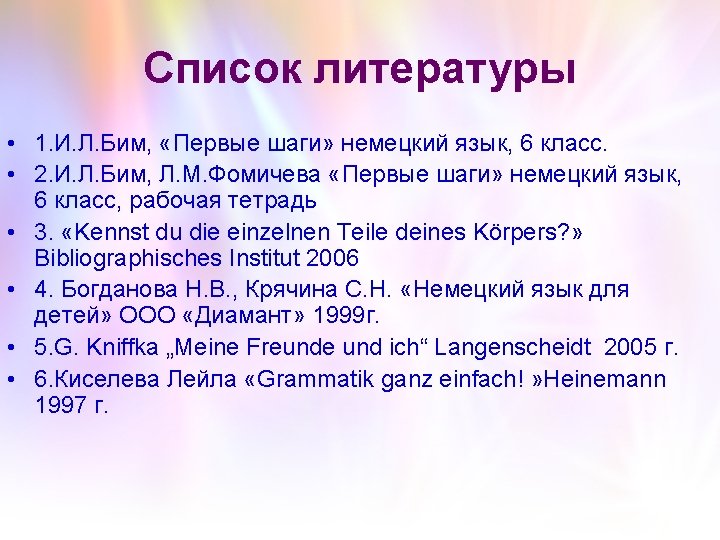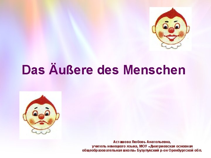 Der Körper - тело • der Kopf – голова (die Köpfe) • der Rücken – спина (die Rücken) • das Bein – нога (die Beine) • der Fuß - нога (стопа) (die Füße). der Schulter – плечо (die Schultern) • das Gesicht – лицо (die Gesichter ) • der Bauch – живот (die Bauche) • der Arm - рука (die Arme) • die Hand – рука (кисть) (die Hände) • der Hals – шея (die Hälse) • die Brust – грудь (die Brüste)