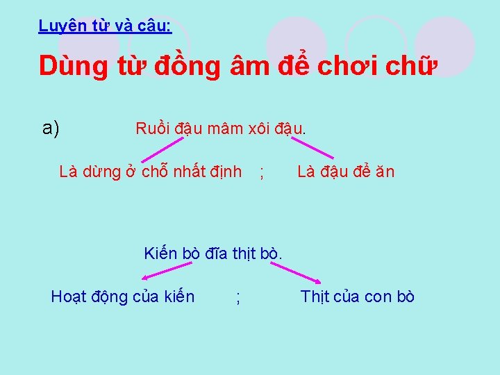 Luyện từ và câu: Dùng từ đồng âm để chơi chữ Bài 1: Các câu sau đã sử dụng những từ đồng âm nào để chơi chữ? a. Ruồi đậu mâm xôi đậu. b. Kiến bò đĩa thịt bò. b. Một nghề cho chín còn hơn chín nghề. c. Bác bác trứng, tôi vôi. d. Con ngựa đá con ngựa đá, con ngựa đá không đá con ngựa.