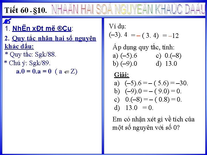 Tiết 60 - § 10. 1. NhËn xÐt më ®Çu: 2. Quy tắc nhân hai số nguyên khác dấu: * Quy tắc: Sgk/88. * Chú ý: Sgk/89. a. 0 = 0. a = 0 ( a Z) * Ví dụ: Sgk/89. ? 4– Sgk/89. Tính: a) 5. (– 14) = – ( 5. 14) = – 70. b) (– 25). 12 = – ( 25. 12) = – 300. 3. Bài tập: