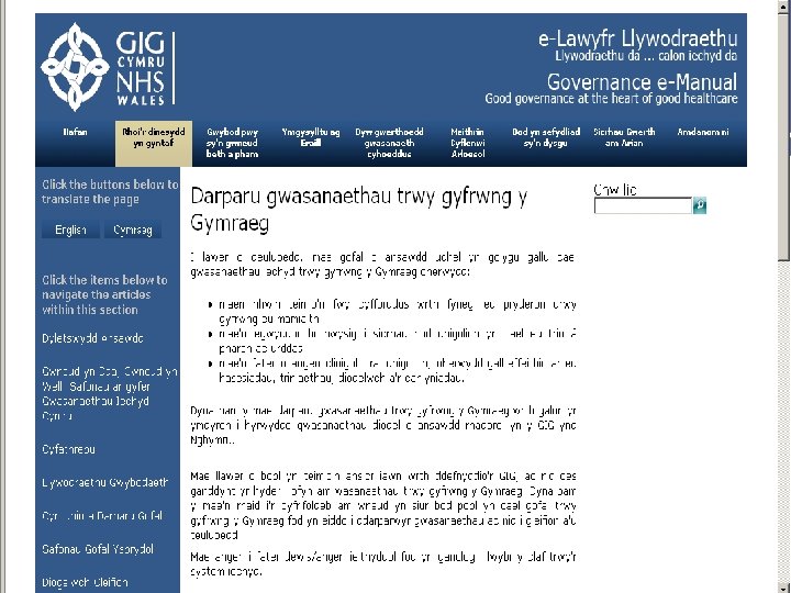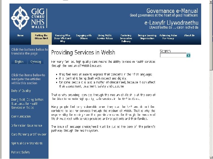 Defnyddio eich awgrymiadau Using your suggestions Mae manylion am sut y dylai sefydliadau fodloni’r safonau yn e-Lawlyfr Llywodraethu GIG Cymru Detail about how organisations should be meeting the standards is provided in the NHS Wales Governance e-Manual www. nhswalesgovernance. com Mae ardal ar y wefan yn barod – ‘Darparu Gwasanaethau trwy gyfrwng y Gymraeg’ The website already features an area – ‘Providing Services in Welsh’