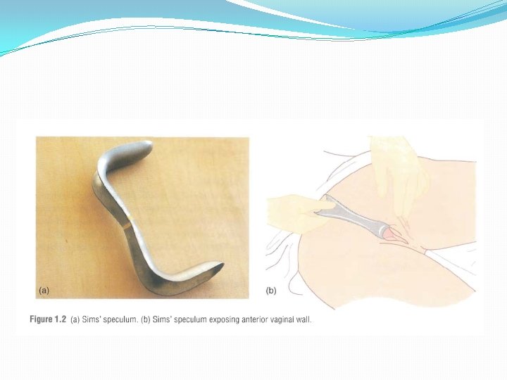 � 4. Wash hands, wear gloves and use sterile speculum after warming it. 5. The patient's external genitalia examined under good light in dorsal position with hips flexed and abducted and knees flexed. 6. Cusco's bivalve speculum is inserted while closed in oblique direction with the lock directed posteriorly then opened to visualize the cervix and fix the screw