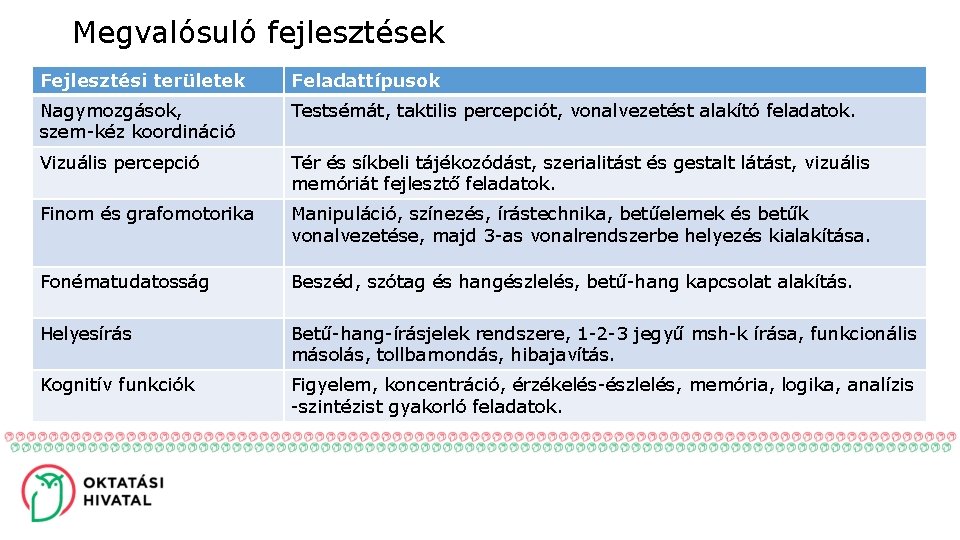 Megvalósuló fejlesztések Fejlesztési területek Feladattípusok Nagymozgások, szem-kéz koordináció Testsémát, taktilis percepciót, vonalvezetést alakító feladatok. Vizuális percepció Tér és síkbeli tájékozódást, szerialitást és gestalt látást, vizuális memóriát fejlesztő feladatok. Finom és grafomotorika Manipuláció, színezés, írástechnika, betűelemek és betűk vonalvezetése, majd 3 -as vonalrendszerbe helyezés kialakítása. Fonématudatosság Beszéd, szótag és hangészlelés, betű-hang kapcsolat alakítás. Helyesírás Betű-hang-írásjelek rendszere, 1 -2 -3 jegyű msh-k írása, funkcionális másolás, tollbamondás, hibajavítás. Kognitív funkciók Figyelem, koncentráció, érzékelés-észlelés, memória, logika, analízis -szintézist gyakorló feladatok.
