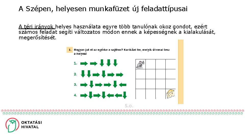 A Szépen, helyesen munkafüzet új feladattípusai A téri irányok helyes használata egyre több tanulónak okoz gondot, ezért számos feladat segíti változatos módon ennek a képességnek a kialakulását, megerősítését. 5. o.