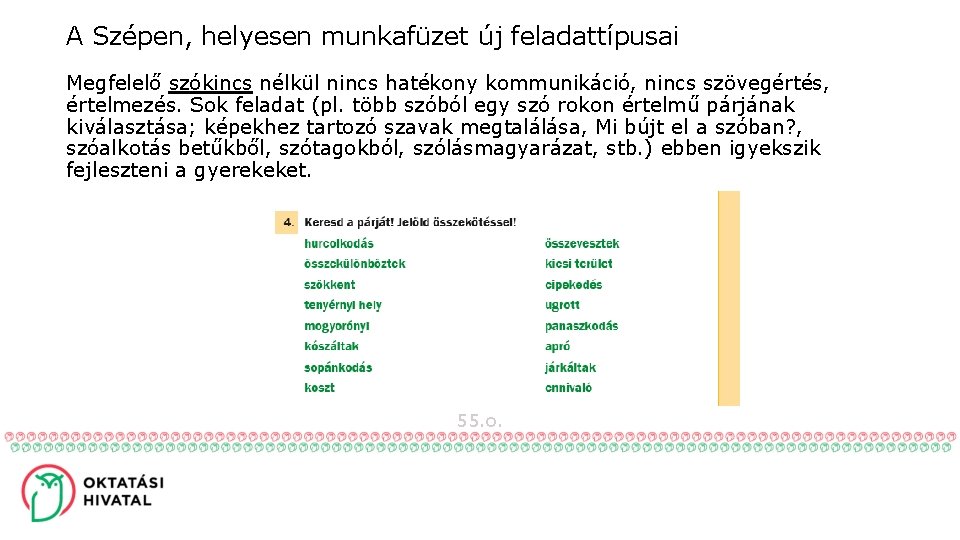 A Szépen, helyesen munkafüzet új feladattípusai Megfelelő szókincs nélkül nincs hatékony kommunikáció, nincs szövegértés, értelmezés. Sok feladat (pl. több szóból egy szó rokon értelmű párjának kiválasztása; képekhez tartozó szavak megtalálása, Mi bújt el a szóban? , szóalkotás betűkből, szótagokból, szólásmagyarázat, stb. ) ebben igyekszik fejleszteni a gyerekeket. 55. o.