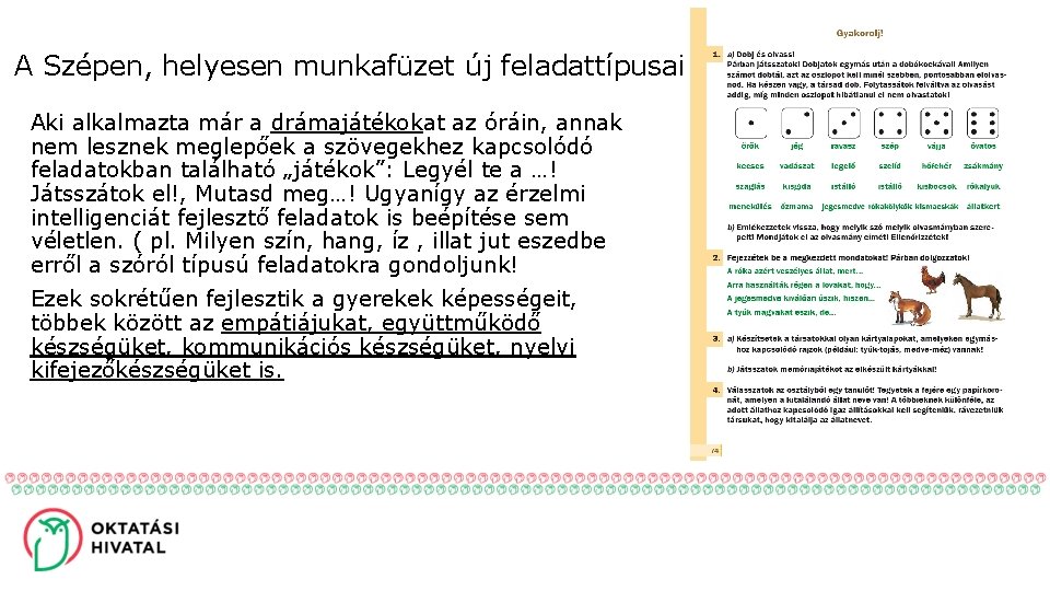 A Szépen, helyesen munkafüzet új feladattípusai Aki alkalmazta már a drámajátékokat az óráin, annak nem lesznek meglepőek a szövegekhez kapcsolódó feladatokban található „játékok”: Legyél te a …! Játsszátok el!, Mutasd meg…! Ugyanígy az érzelmi intelligenciát fejlesztő feladatok is beépítése sem véletlen. ( pl. Milyen szín, hang, íz , illat jut eszedbe erről a szóról típusú feladatokra gondoljunk! Ezek sokrétűen fejlesztik a gyerekek képességeit, többek között az empátiájukat, együttműködő készségüket, kommunikációs készségüket, nyelvi kifejezőkészségüket is.