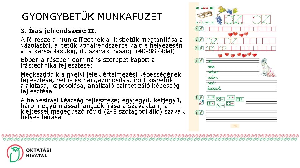 GYÖNGYBETŰK MUNKAFÜZET 3. Írás jelrendszere II. A fő része a munkafüzetnek a kisbetűk megtanítása a vázolástól, a betűk vonalrendszerbe való elhelyezésén át a kapcsolásukig, ill. szavak írásáig. (40 -88. oldal) Ebben a részben domináns szerepet kapott a írástechnika fejlesztése: Megkezdődik a nyelvi jelek értelmezési képességének fejlesztése, betű- és hangazonosítás, írott kisbetűk alakítása, kapcsolása, analizáló-szintetizáló képesség fejlesztése A helyesírási készség fejlesztése; egyjegyű, kétjegyű, háromjegyű mássalhangzók írása a szavakban; a kiejtéssel megegyező rövid (2 -3 szótagból álló) szavak helyes leírása.