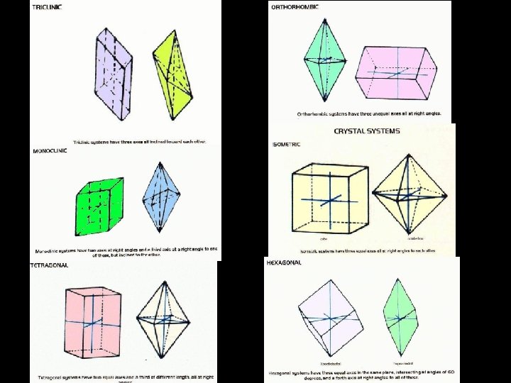 • Note that the 32 crystal classes are divided into 6 crystal systems. • The Triclinic System has only 1 -fold or 1 fold rotoinversion axes. • The Monoclinic System has only mirror plane(s) or a single 2 -fold axis. • The Orthorhombic System has only two fold axes or a 2 -fold axis and 2 mirror planes. • The Tetragonal System has either a single 4 -fold or 4 -fold rotoinversion axis. • The Hexagonal System has no 4 -fold axes, but has at least 1 6 -fold or 3 -fold axis. • The Isometric System has either 4 3 -fold axes or 4 3 -fold rotoinversion axes.