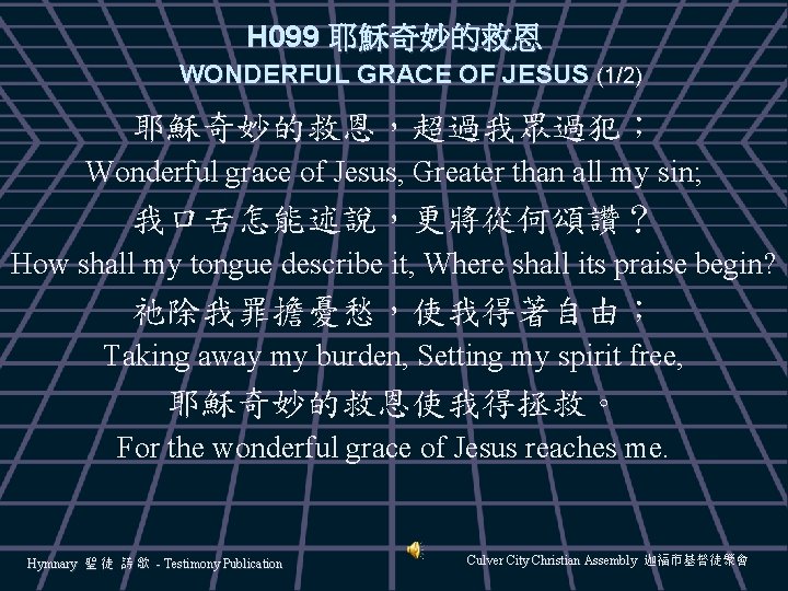 H 099 (節2/2, 頁1/3) 耶穌奇妙的救恩,臨到失喪之人; Wonderful grace of Jesus, Reaching to all the lost, 藉救恩我罪得赦,並拯救我靈魂。 By it I have been pardoned, Saved to the uttermost, 主為我解脫捆綁,使我得著釋放; Chains have been torn asunder, Giving me liberty; 耶穌奇妙的救恩使我得拯救。 For the wonderful grace of Jesus reaches me. Hymnary 聖 徒 詩 歌 - Testimony Publication Culver City Christian Assembly 迦福市基督徒聚會