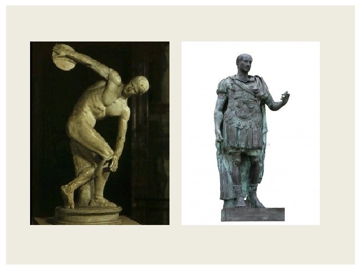 DE KLASSIEKE CULTUUR De Romeinen nemen veel van de Griekse cultuur (bijv. de goden) over en voegen nieuwe elementen toe Grieken Idealistisch (denkers) Rechte vormen en harmonisch geheel Vooral goden, helden en sporters (mooie figuren) Vooral tempels Romeinen Realistisch (doeners) Meer techniek (ronde vormen, bogen) Verschillende materialen (beton bijv. ) Ook ‘lelijke’ mensen Praktische gebouwen (zoals aquaducten)