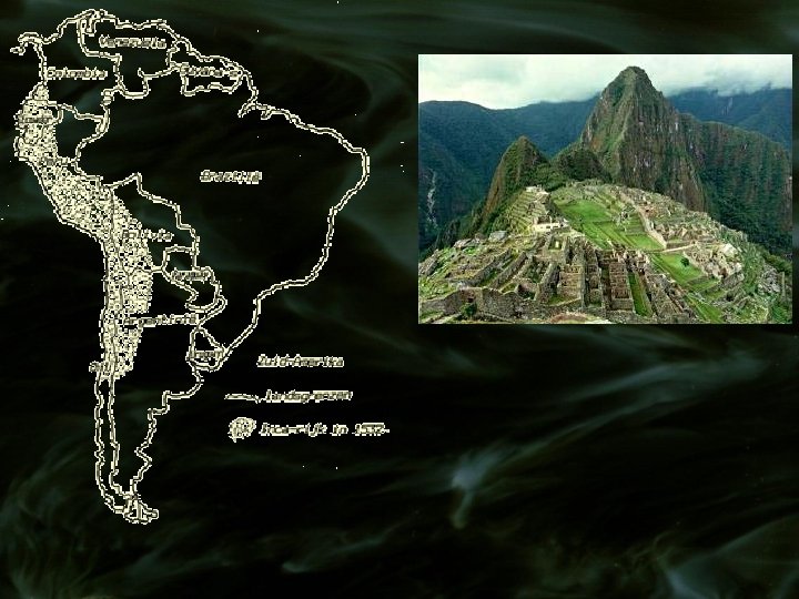 Spanje > Inca’s (Andesgebergte) 1200 1460 1526 1533 1572 Cuzco Bloeiperiode dood Sapa-Inca – Spaanse contacten (Pizarro) Spaanse overheersing laatste opstand Inca’s Religie: polytheïsme natuurgodsdienst, zonnecultus astronomie, wiskunde, offeren Economie: boerenbevolking * land van de zon * land van de Inca * land van de gemeenschap handel