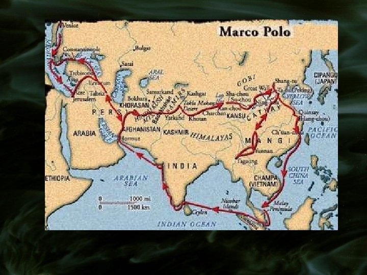 Marco Polo 1271 Marco Polo naar China (samen met vader en broer) Kubilai Kahn (Mongools leider) keizer China - Marco Polo maakt in diens naam reizen naar Tibet - 1285 -1287 gouverneur van Nanking 1295 Marco Polo terug in Venetië Oorlog tussen Genua en Venetië - Marco Polo gevangen - boek: ‘Il Milione’ - geschiedschrijving over Azië - rijkdom - inspiratie ontdekkingsreizigers