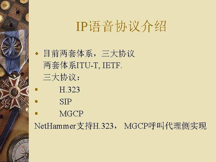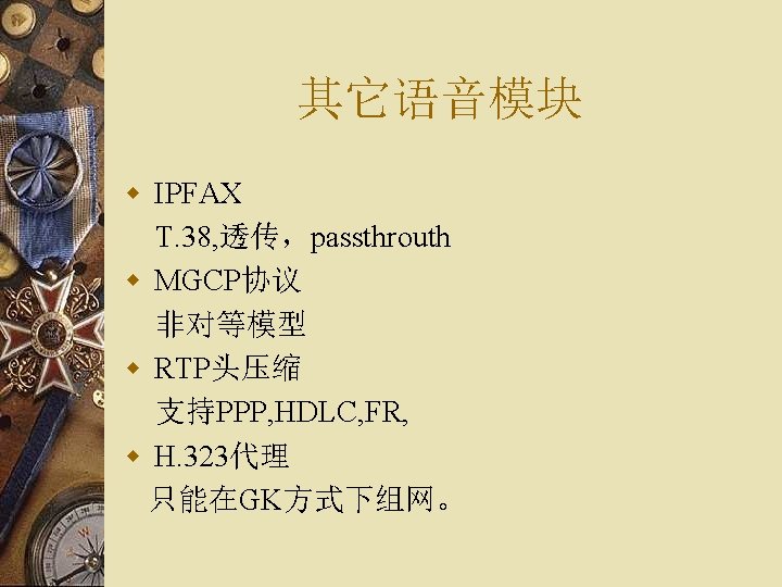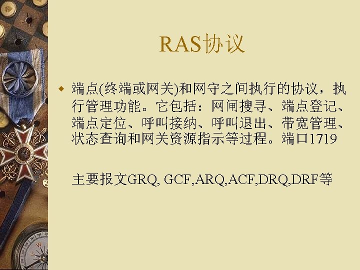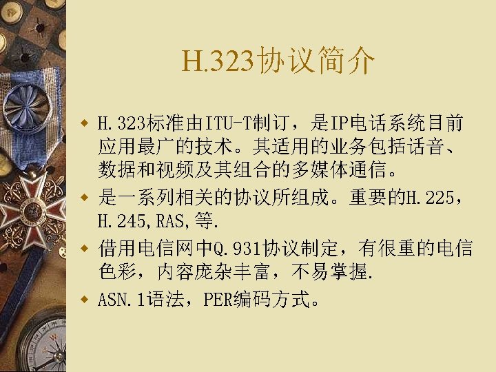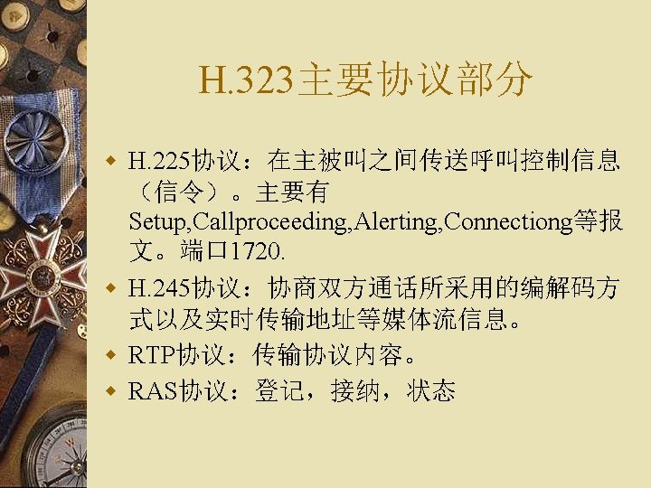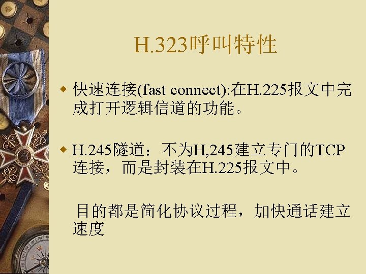 H. 323协议栈结构 多H. 323 媒体应用 数据应用 媒体控制 Audio Codecs G. 711 G. 723. 1 G. 729. . V. 150 T. 120 终端控制和管理 Video Codecs H. 261 H. 263 H. 264. . T. 38 RTCP H. 245 媒体 信道 控制 H. 225. 0 呼叫 信令 TCP/UDP TCP H. 225. 0 RAS 终端至 网闸 信令 RTP UDP TCP/UDP IP UDP