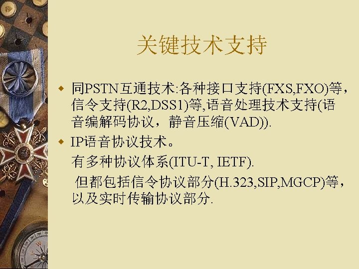 H. 245协商 Terminal Capability Set Ack Master Slave Determination Ack Open Logical Channnel GW Open Logical Channnel Ack Talking (RTP/RTCP) Close Logical Channel Ack 本图只演示了一个方向的H 245协商过程,实际 情况应该是两个方向同时开始协商 GW