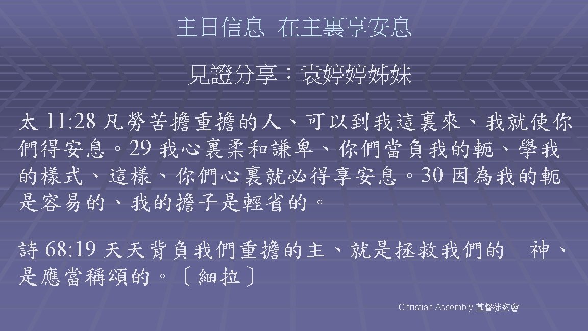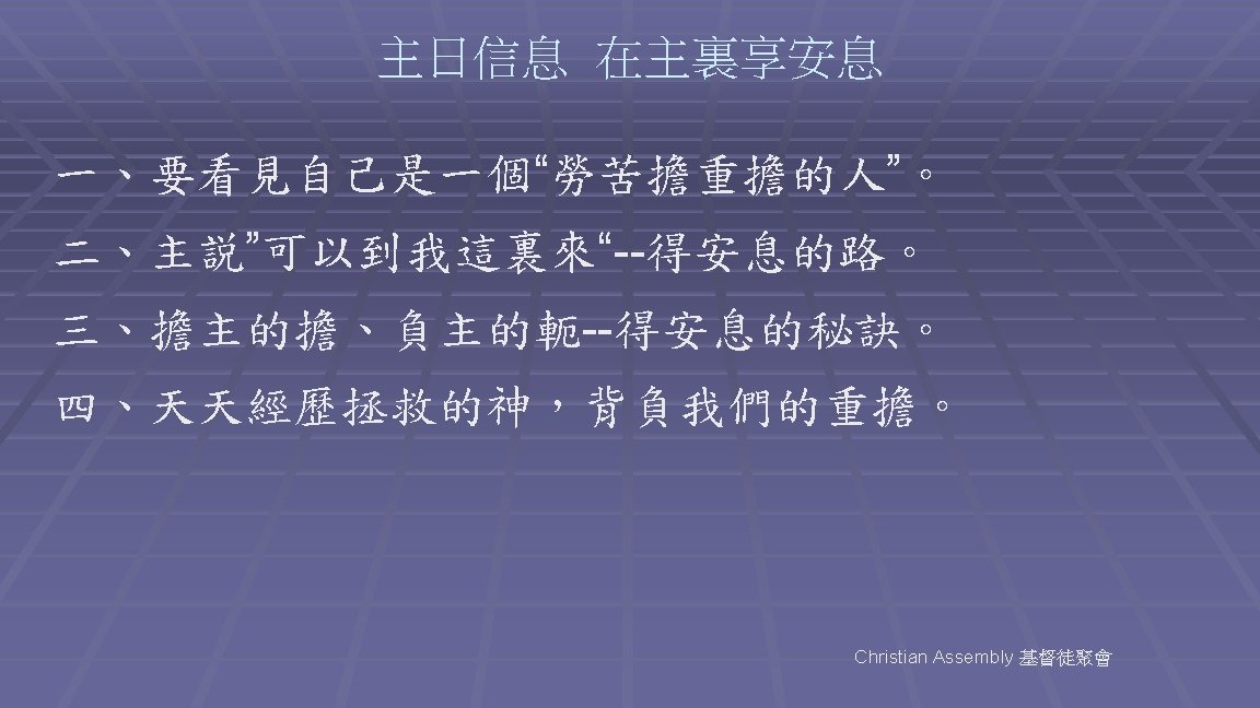 H 490 (節3/3, 頁1/2) 耶穌是我避難所,耶穌為我受死; Jesus, my heart’s dear Refuge, Jesus has died for me; 我的信心要信託 神的萬世磐石。 Firm on the Rock of Ages Ever my trust shall be. 在此讓我忍耐等,等到忍耐已過; Here let me wait with patience Wait till the night is over, 等到羔羊從新城 成全我所信託。 Wait till I see the morning Break on the golden shore. Hymnary 聖徒詩歌 - Testimony Publication Christian Assembly 基督徒聚會